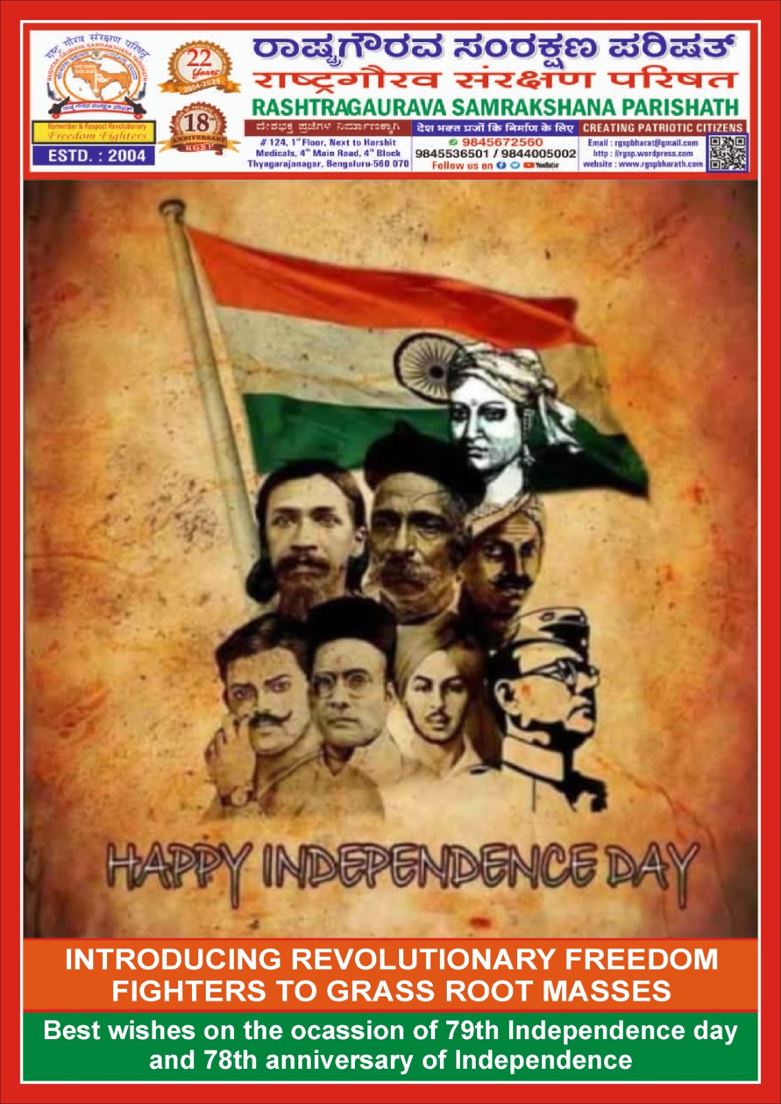 Rashtra gaurava samrakshana parishath wishes on the ocassion of 79th Indian Independence day and 78th anniversary of Indian Independence. Let us REMEMBER, RESPECT OUR UNHEARD, UNSUNG, UNWEPT, UNWORSHIPPED REVOLUTIONARY FREEDOM FIGHTERS sacrifices in achieving political independence of our country BHARATH – INDIA JAI HIND, VANDE MATARAM.