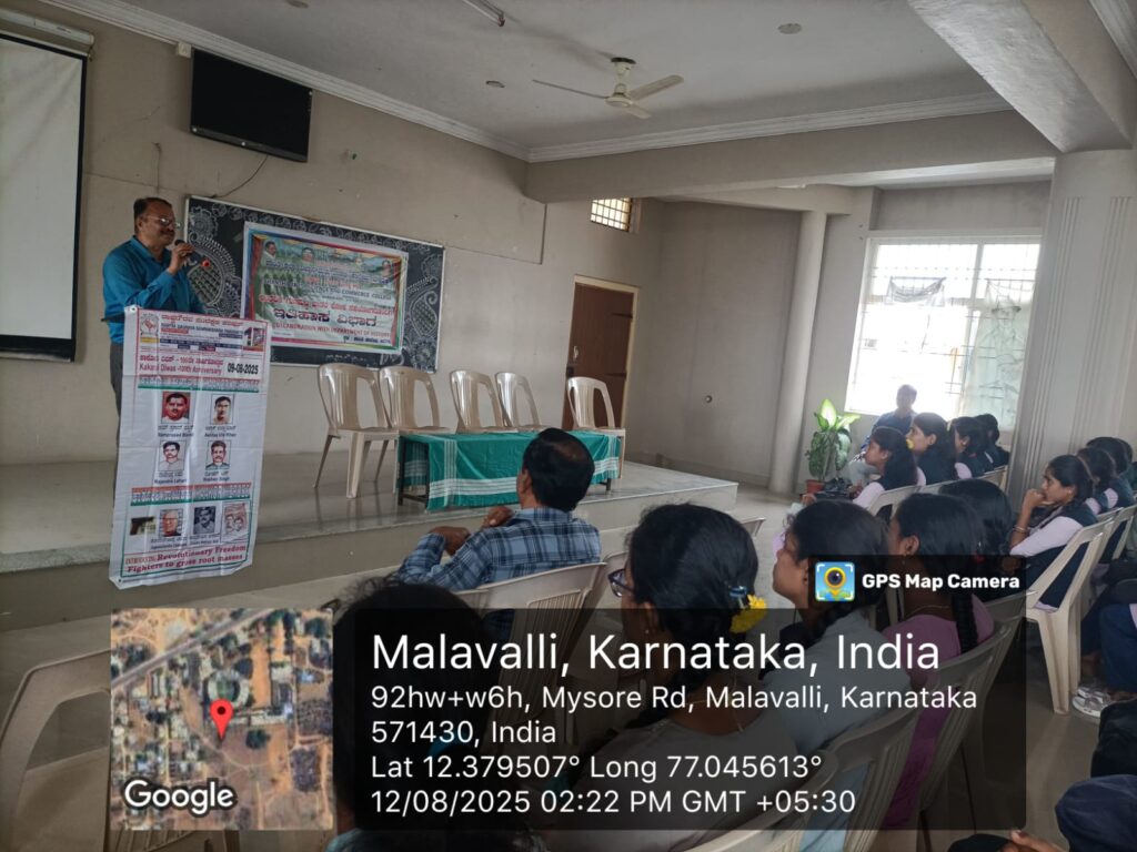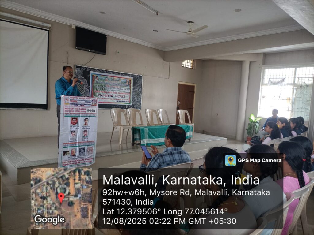 Kakori train action 100 years celebrated by Rashtra Gaurava samrakshana parishath www.rgspbharath.com at Shanti First grade college, Malavalli on 12.08.2025. Also an exhibition of portraits of revolutionary freedom fighters was also organized as a part of celebrations. T N Ramakrishna President of Rashtra Gaurava Samrakshana Parishath addressed students and teaching staff.